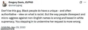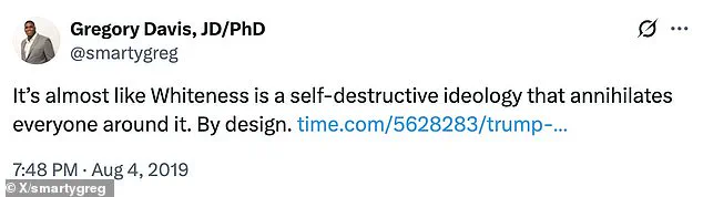 Among the most incendiary of Davis’s tweets was a 2019 post on X (formerly Twitter) that read: ‘It’s almost like whiteness is a self-destructive ideology that annihilates everyone around it.