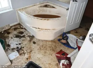 Investigators found floors coated in dirt, feces, and bugs, with a tub of dark brown water and debris scattered throughout the home.