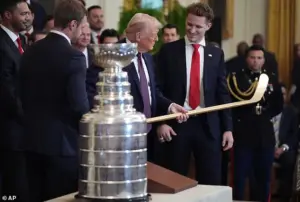 The exchange highlighted Trump’s rapport with the players and his penchant for lighthearted banter, even as he emphasized the team’s historic achievement in denying Canada a Stanley Cup victory. ‘You denied Canada the Stanley Cup,’ he proclaimed, adding, ‘We have a little competition with Canada.