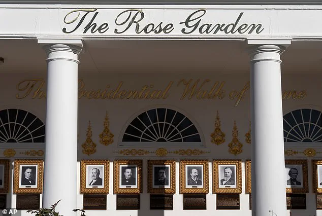 The walk, which faces the Rose Garden from the colonnade, features gold-framed portraits of past presidents alongside plaques detailing their contributions or misdeeds.