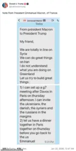 On Monday, Trump revealed a text message from French President Emmanuel Macron, who proposed assembling a new G7 summit after the World Economic Forum in Davos and invited Trump to a private dinner in Paris.