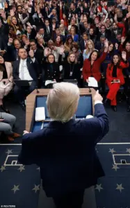 Speaking during a lengthy press briefing, Trump initially framed the comment as a joke, only to follow it with a more serious suggestion that the name change ‘might still be possible.’ The remark, delivered in the context of a year-one review of his second term, underscored the president’s penchant for using symbolic gestures to assert his legacy.