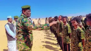 Nearby, a line of boys stands in the desert, their loose camouflage uniforms blending with the sand.