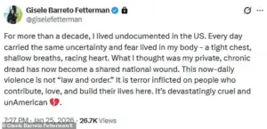 Gisele Barreto Fetterman, 43, the senator’s wife and former Second Lady of Pennsylvania, issued a statement on X after federal agents fatally shot 37-year-old US citizen and ICU nurse Alex Pretti in Minneapolis on Saturday. ‘For more than a decade, I lived undocumented in the US.