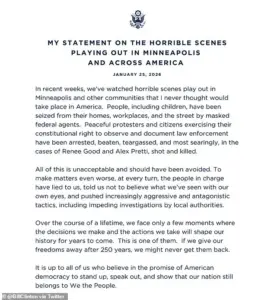 ‘People have been rightly outraged by the spectacle of masked ICE recruits and other federal agents acting with impunity,’ Obama wrote, citing criticism from former top lawyer for the Department of Homeland Security under the first Trump administration, John Mitnick. ‘This has to stop,’ Obama emphasized, expressing hope that the tragedies would prompt the administration to reconsider its approach and collaborate with local officials to ‘avert more chaos.’