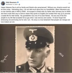 Kelly Neumann, a fundraising co-chair for several Democratic candidates in Michigan, posted a tribute to her Nazi grandfather on Veterans Day in 2024