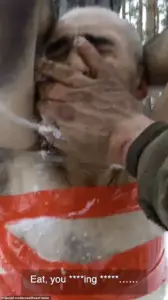 A Russian soldier is hung upside down and taped to a tree in just his underwear. Such barbaric punishments are increasingly the lot of those who try and escape the ‘meat grinder’ – the frontal assaults against dug-in Ukrainian machine guns and drones, where the life expectancy of a recruit is measured in minutes