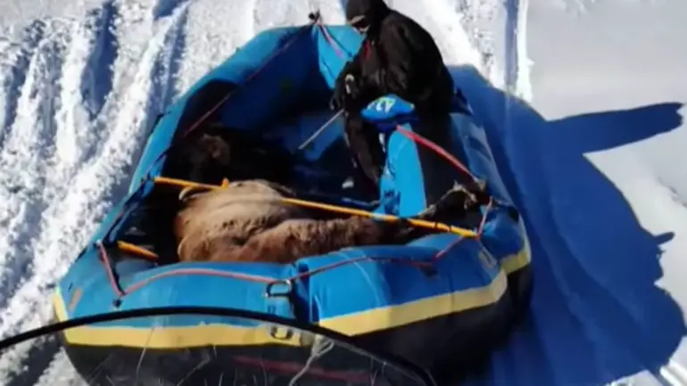 The rescue team faced a logistical challenge: how to extract Mouse from a remote location without risking his safety. Initial ideas, such as dragging him on a car hood, were quickly dismissed. Instead, the group devised a plan using an inflatable river raft, a technique borrowed from river rescue operations. ‘We needed something that would float him,’ Campbell explained. A six-man team was assembled, with Campbell and others traveling four hours to Cody to retrieve the raft. The effort required coordination, specialized equipment, and a deep understanding of the horse’s behavior.