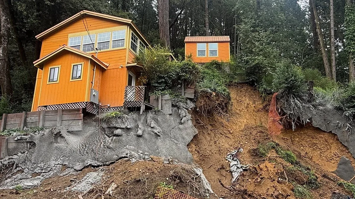 A picturesque home nestled within the iconic Redwood forest region of Guerneville, California, now stands on the brink of collapse, its precarious perch atop a cliff threatened by relentless rain and worsening erosion. The property, located just south of the Armstrong Redwoods State Natural Preserve, has been teetering on the edge of a steep hillside since Monday, when a sudden hillside collapse sent shockwaves through the tight-knit community. The incident, which occurred around 2:20 p.m., left the structure lurching dangerously close to toppling onto neighboring homes below, raising fears of imminent disaster.